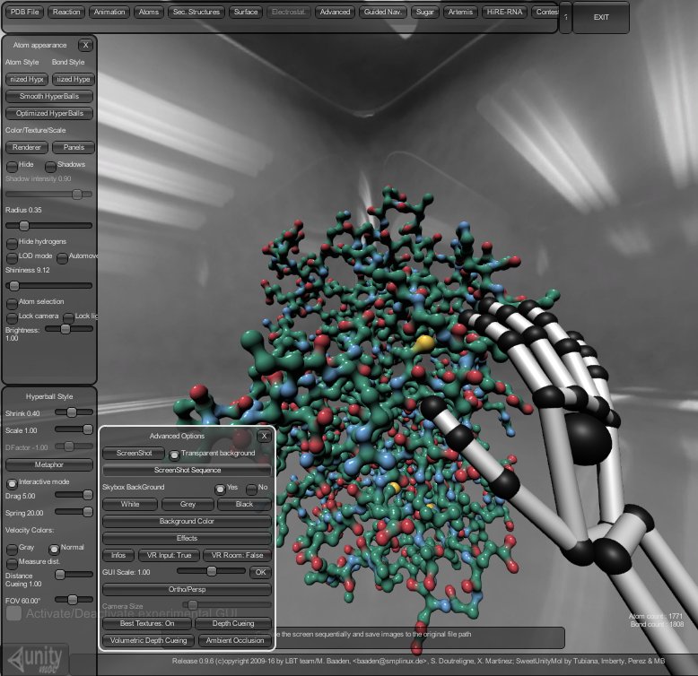 Here is an experiment with UnityMol VR, Oculus + LeapMotion using Unity’s physical engine. First a screenshot: